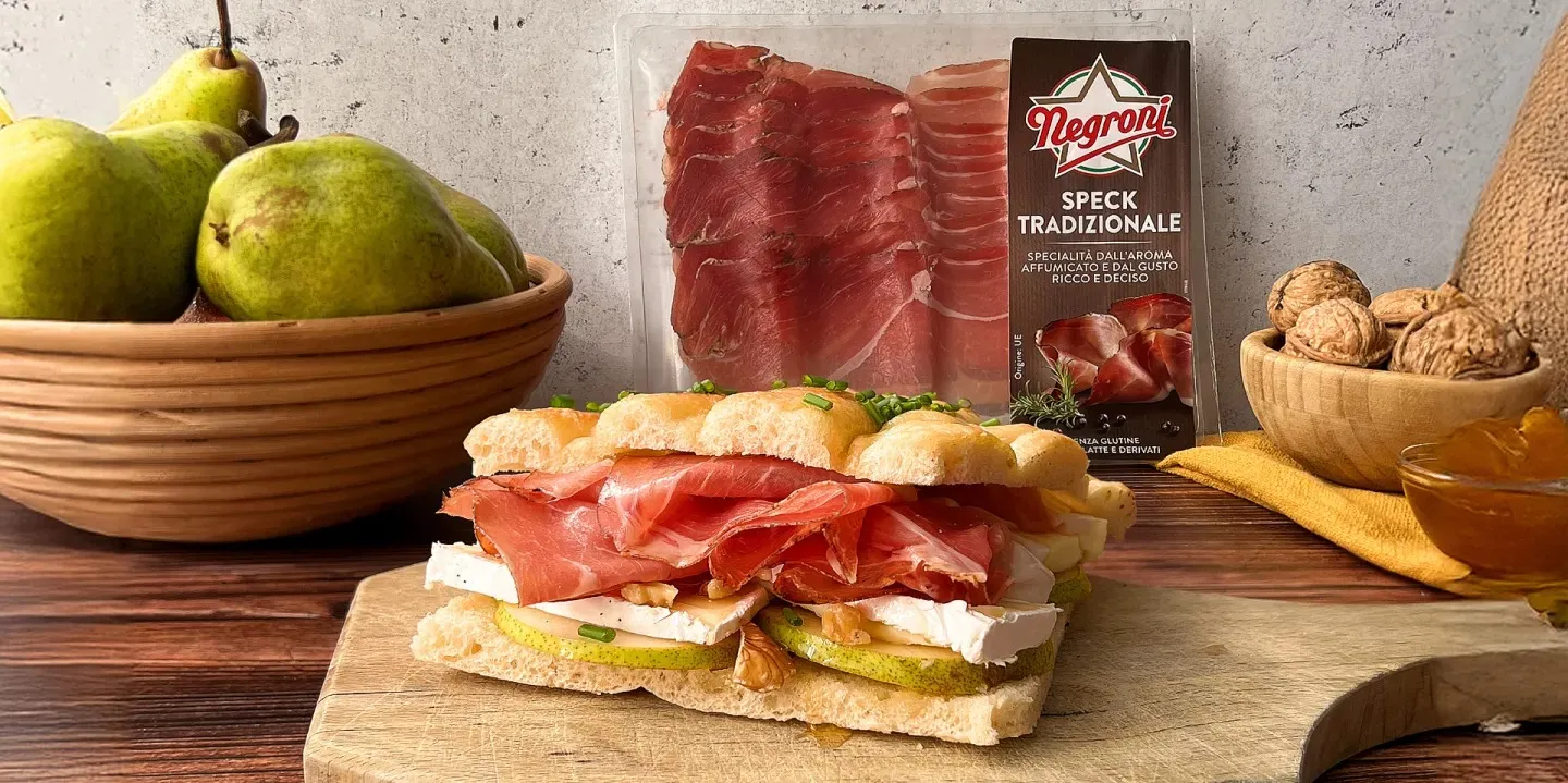 Sapori e profumi autunnali si fondono alle note di montagna in un panino con speck, brie, pere, miele e noci: un vero concentrato di gusto ed eleganza.