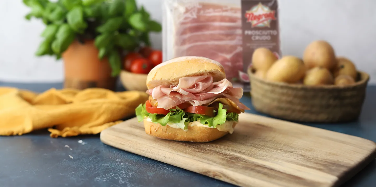 Tagliate il panino a metà e spalmate la maionese su un lato (leggete qui la ricetta per una deliziosa maionese fatta in casa), disponete le foglie di insalata, le fette di pomodoro, di seguito le chips e il Prosciutto Crudo Stella Negroni.