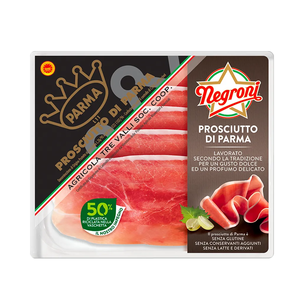Il Prosciutto Crudo di Parma nasce esclusivamente nelle colline parmensi. La lunga stagionatura dona a questo prodotto un'armonia unica tra aroma intenso, gusto dolce, consistenza corposa e vellutata.