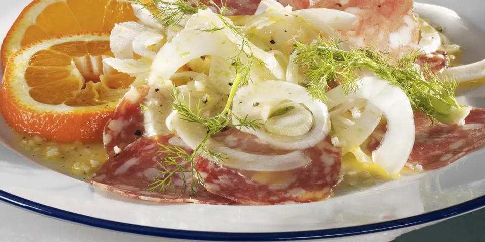 Antipasto alla calabra: insalata di salame, finocchi e arance