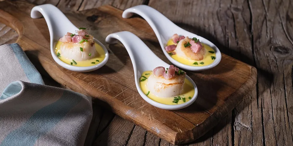 Capesante scottate con pancetta a cubetti e zabaione salato