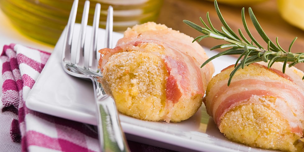 Per un pranzo in ufficio oppure per un pic nic le crocchette di patate con pancetta sono sfiziose e golose. Potete usare la pancetta per avvolgere la crocchetta oppure nasconderla al centro della polpetta insieme al formaggio, così il cuore filante e saporito sarà una sorpresa per i commensali.