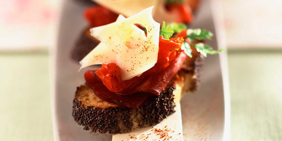 Si può fare un crostino di pane usando una pagnotta artigianale oppure divertirsi a scegliere qualche tipo di pane un po' diverso dai soliti. In questo caso abbiamo usato una pane ai semi di papavero che si può anche preparare in casa usando una classica ricetta di pane che prima della cottura andrà "impanato" nei semi di papavero. Questi daranno alla base del crostino un gusto davvero unico.