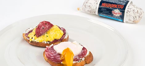 Rompere le uova in una ciotola, condirle con sale, pepe e sbatterle con una frusta. Cuocerle in una padella con un filo di olio evo per massimo 3/4 min in modo che rimangano morbide continuando a mescolare. Condire il caprino in una ciotola con un pizzico di sale e pepe e un cucchiaio di olio e infine aggiungerci il trito di rosmarino. Infornare le fette di pane a 180° per 2/3 minuti con un filo di olio, impiattare con la fetta di pane, con sopra una spalmata di caprino, uovo morbido e le fette di Negronetto pelate.