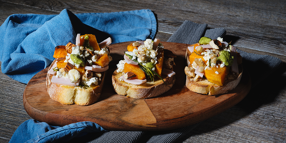 Crostoni di zucca con tacchino, salsa verde e frutta secca