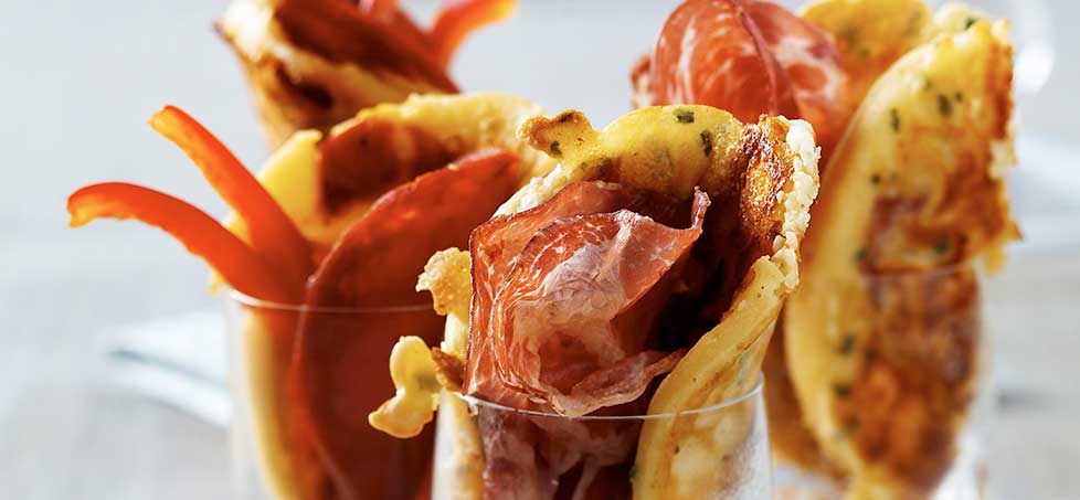 Preparate i bicchierini, sistemate la coppa, mezza fettina di mozzarella e qualche striscia di peperone su ciascun blinis. Piegateli a metà e infilateli nei bicchierini - quelli per il limoncello o la vodka saranno perfetti - magari decorando con un filo di miele.