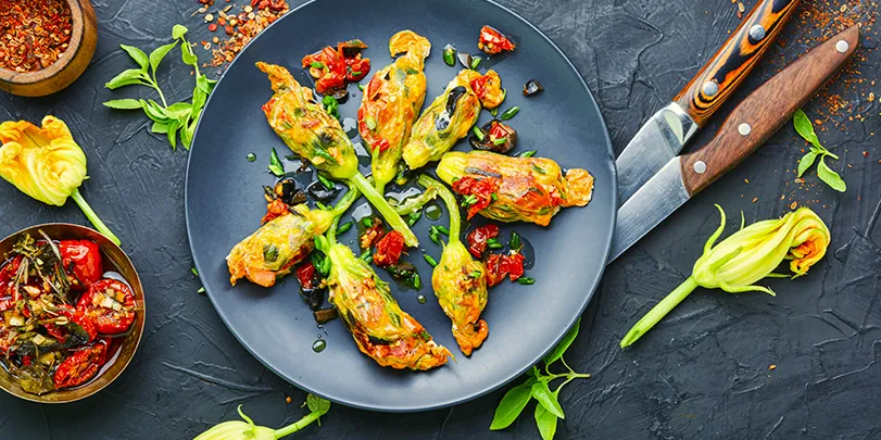 Fiori di zucca ripieni di cubetti di pancetta affumicata
