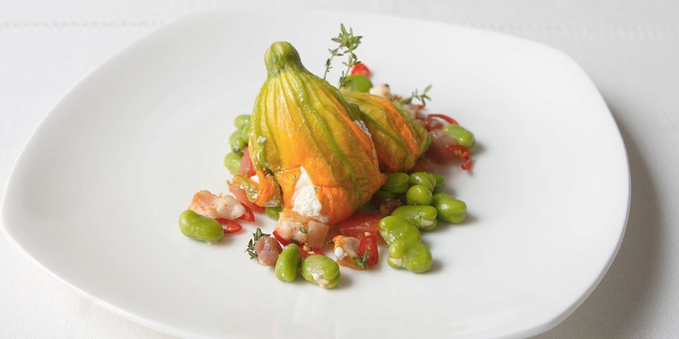 Un piatto che celebra la bella stagione: i fiori di zucca ripieni di ricotta con le fave hanno un cuore piccantino di deliziosa pancetta