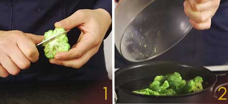 Pulite i broccoli conservando le cimette e incidendo la parte più coriacea (1) quindi metteteli a cuocere in acqua bollente salata per 4/5 minuti (2). Una volta cotti, scolateli e lasciateli raffreddare.