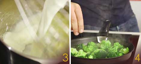 Preparate una besciamella molto liquida: fate sciogliere il burro con la farina e poi inserite il latte (3) mescolando in continuazione insieme al latte per ottenere una besciamella liquida istantanea. In un'altra padella antiaderente sciogliete una noce di burro e fate saltare i broccoli a fiamma molto alta (4) per farli abbrustolire. Aggiustate di sale e metteteli da parte per farli intiepidire di nuovo