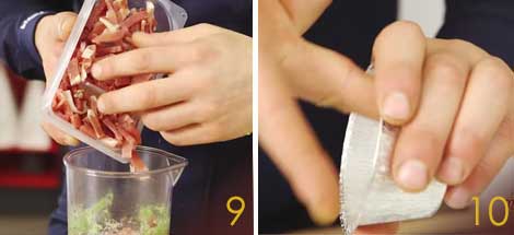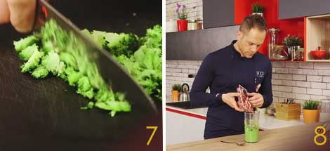 I rimanenti broccoli andranno tagliati al coltello (7) così da ottenere una crema di doppia consistenza e mescolati con un cucchiaio ai broccoli frullati e ai petali di speck Negroni (8) Aggiungete il basilico spezzato con le mani e mescolate per amalgamare tutto.