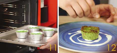 Infornate a 180° per 18 minuti (11) quindi potete impiattarli usando la besciamella con il taleggio come fondo del piatto (12). Potete servire i flan di broccoli sia caldi che freddi.