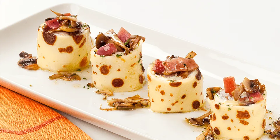 Ecco come preparare gli involtini di crepes con funghi e Prosciutto Crudo in Petali Negroni.