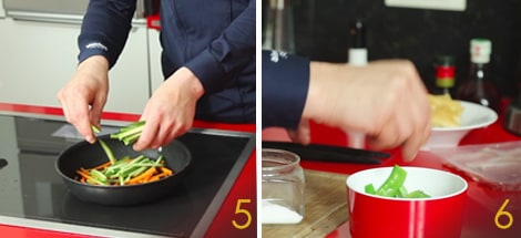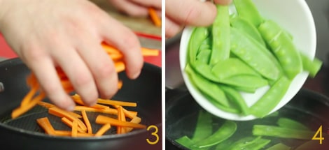 Scaldate una padella antiaderente con un filo di olio e cominciate a far cuocere le carote che hanno bisogno di più tempo. Intanto, in acqua salata e bollente, fate scottare le taccole.