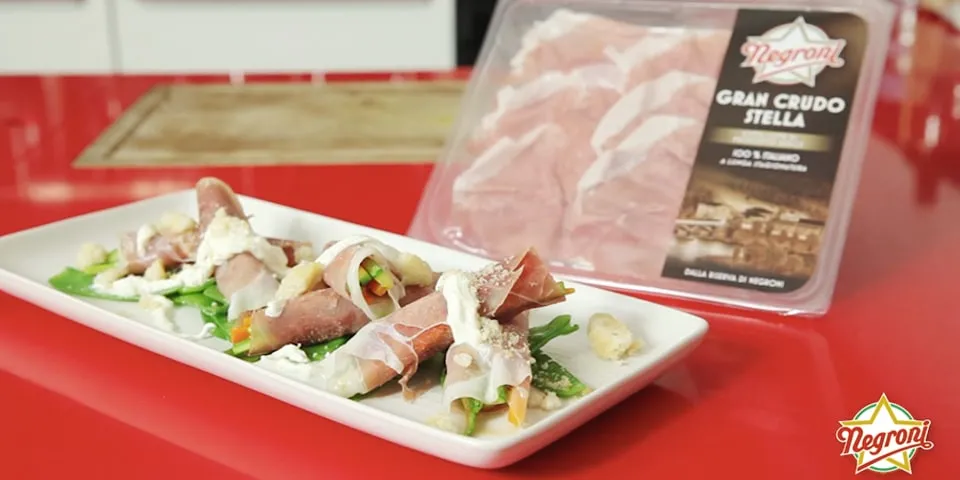 Il prosciutto 100% italiano della riserva Negroni protagonista di un piatto di sicuro effetto: gli involtini con verdure croccanti e burrata.