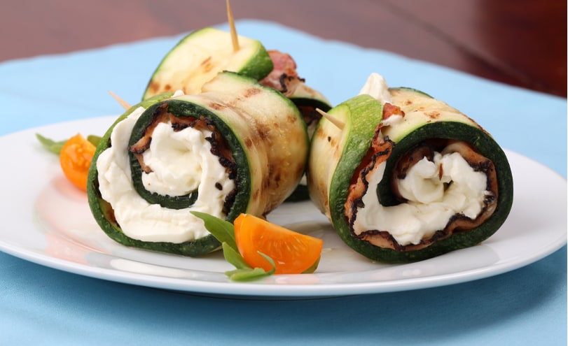 Spalmate sulla base di ogni fetta uno strato di formaggio spalmabile e sopra di esso il Prosciutto Crudo Stella: mezza fetta sarà più che sufficiente, ma potrete regolarvi a occhio, in base anche alla grandezza e allo spessore della zucchina che avete grigliato. A questo punto arrotolate la zucchina e fermatela con uno stuzzicadenti. Ripetete l’operazione con tutte le fette di zucchina.