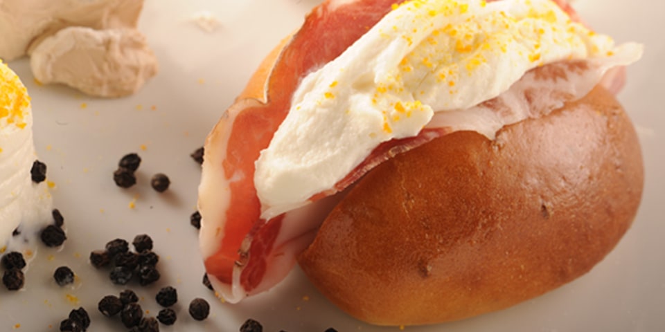 Una volta cotti, aprire i panini con un taglio obliquo nella parte superiore inserendo le fettine di Coppa di Zibello Negroni piegate a metà e, con una sac à poche, la ricotta leggermente ammorbidita. Aggiungere qualche pezzo di arancia candita e una spolverata di pepe macinato. Servire nel piatto con un’acciuga sott’olio.