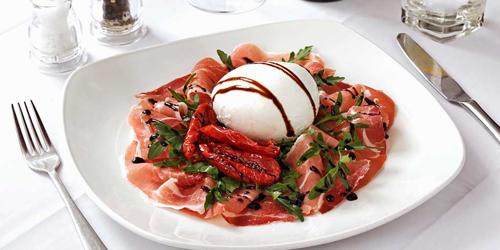 Per un dressing davvero suggestivo provate a condire mozzarella di bufala e prosciutto crudo con dell'aceto balsamico. Un filo sopra il formaggio e un po' sul prosciutto sarà sufficiente per avere un'insalata fantastica.