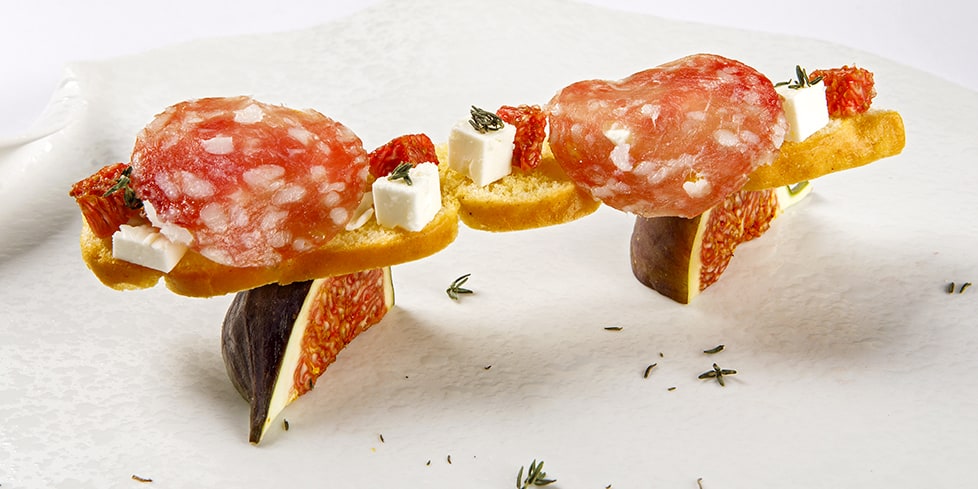 Quelli che a tutti gli effetti possono essere considerati gli ingredienti per un’insalata, diventano un piccolo capolavoro dalla composizione originale e tutta da gustare. La feta viene tagliata a dadini, le fette di Negronetto sono sottili, i fichi invece vengono divisi in quattro parti.