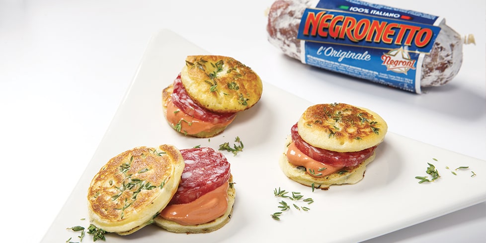 Tagliate delle fette di Negronetto a circa 0,5 cm di spessore e servitele sui pancake insieme ad un cucchiaio di maionese di pomodoro.