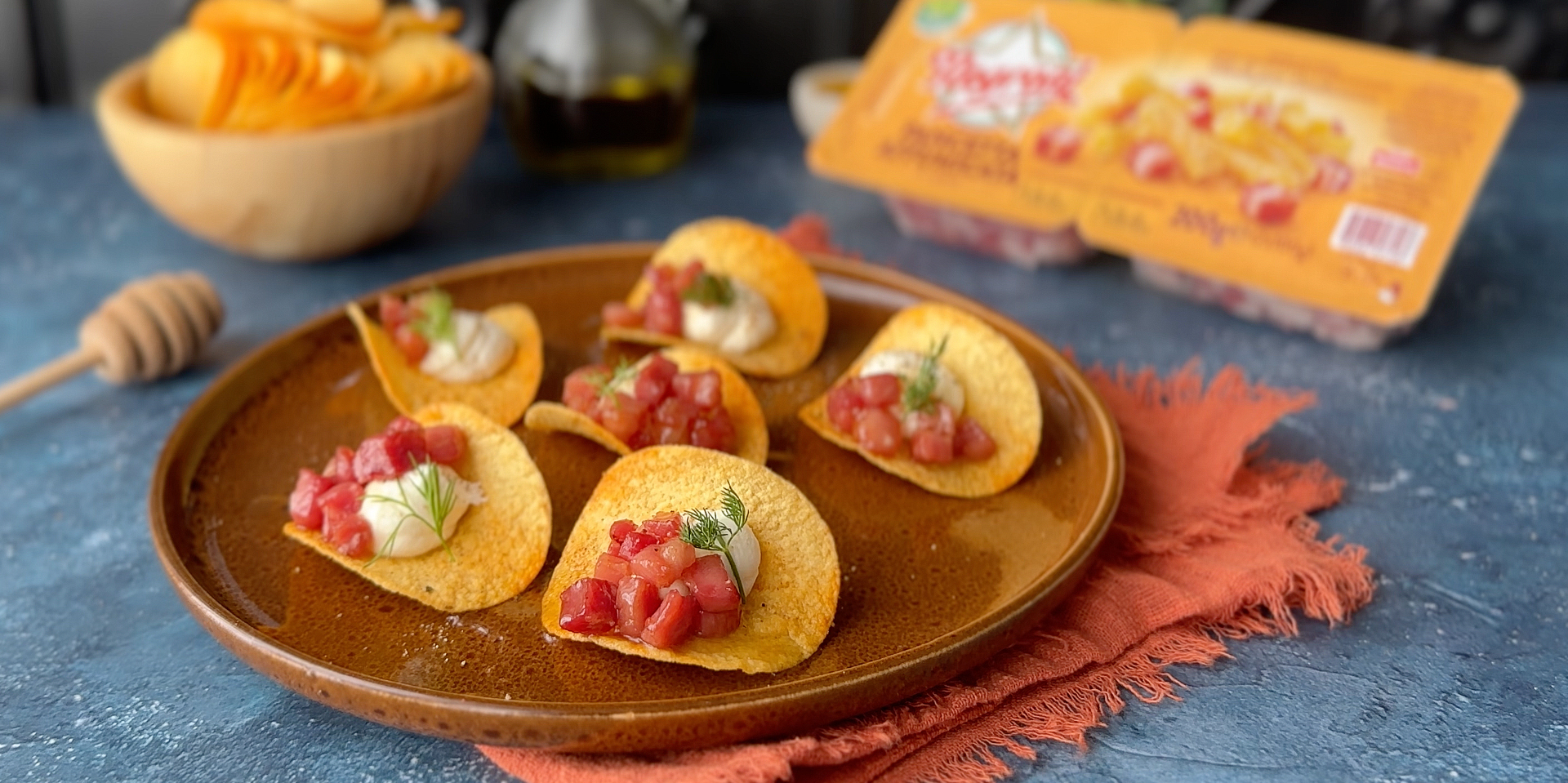 Per una resa perfetta, scegliete patatine piuttosto spesse: sarà più facile farcirle e rimarranno crunchy anche se preparate in anticipo. E per rispettare gli equilibri di gusto tra dolce e salato, vi consigliamo di scegliere patatine al gusto paprika.