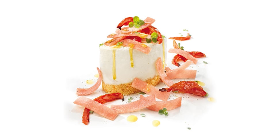 Unitela al composto di formaggi, mescolate bene, salate, pepate e aggiungete le erbe tritate. Versate sulle basi e fate solidificare in frigorifero. Terminate cospargendo di petali di petto di tacchino, guarnite con pomodorini appassiti in forno con erbe, olio, sale e pepe, decorate con maggiorana e gocce di olio extravergine di oliva.
