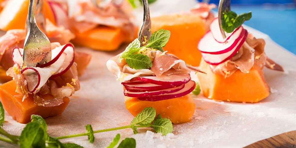 Servite il prosciutto crudo con la papaya in mono porzioni finger food e avrete un simpatico aperitivo per gli amici.