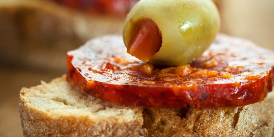 Aggiungete sopra le fette delle olive snocciolate e piccanti per aumentare il sapore forte dell'aperitivo. Il drink ideale per gli stuzzichini per aperitivi è un bicchiere di vino rosso: meglio un buon Merlot che ricorda il gusto corposo del formaggio scelto.