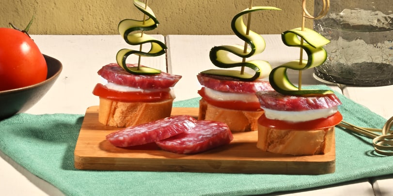 Assemblate ora le vostre tartine mettendo sul piatto le fette di pane, le fette di pomodoro, la mozzarella, le fette di Negronetto e decorate sistemando a S le fette di zucchina aiutandovi con uno stecchino da aperitivo.