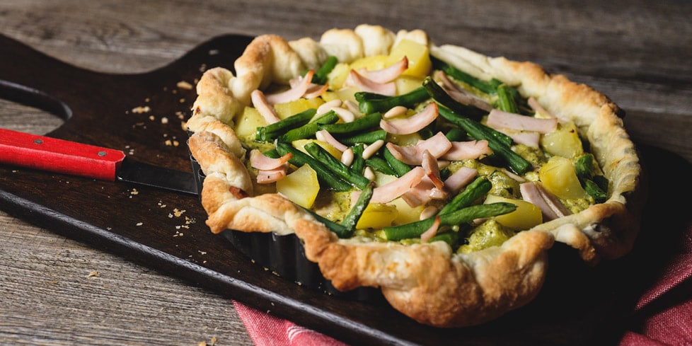 Torta salata al pesto, fagiolini, patate e petto di tacchino
