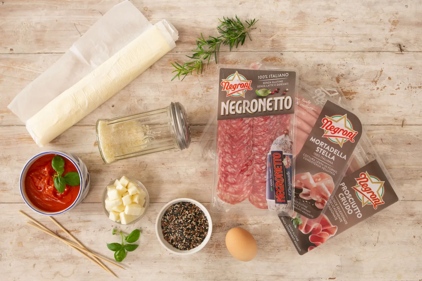 Ora dedicatevi alla preparazione delle pizzette: dividete l’altra metà della pasta sfoglia in tanti piccoli quadrati e bucherellate con i lembi della forchetta al centro. Mettete un cucchiaino di salsa di pomodoro, poi dei cubettini di formaggio e in alcuni il Salame Negronetto Negroni. Su alcuni unite anche il basilico. Infornate le pizzette seguendo e gli altri salatini in forno preriscaldato.