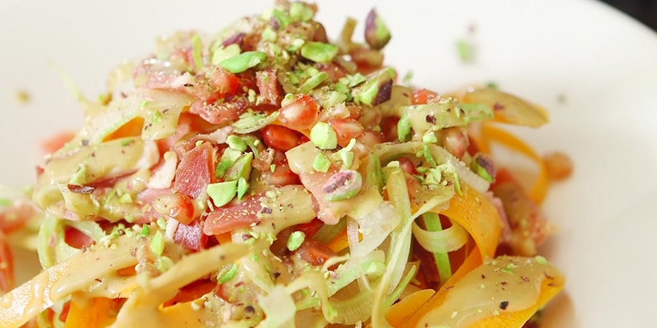 Basta con la solita insalata mista, tra le ricette estive più golose salviamo quella firmata da Simone Rugiati con il prosciutto crudo e la salsa di fichi. Questo piatto, velocissimo da preparare e molto semplice nei suoi pochi passaggi, è quello che mancava. L'idea di fondo è di mescolare verdure croccanti come le carote e il sedano e di abbinarle alla dolcezza della mela verde, all'aspro del melograno e condire il tutto con un dressing di fichi maturi.