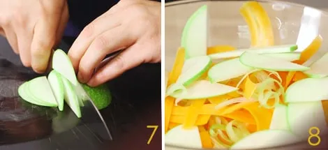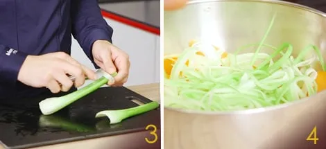 Sempre con il pelapatate tagliate a striscioline anche il sedano (3) e sistemate entrambe le verdure in una bacinella (4) che va coperta con acqua e lasciata riposare nel freezer per mantenere la verdura molto croccante