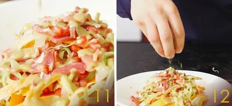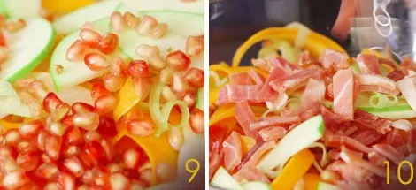 Aggiungete all'insalata gli arilli di melograno (9) , lo Speck in petali Negroni che è pronto per essere consumato e mescolate con le mani (10).