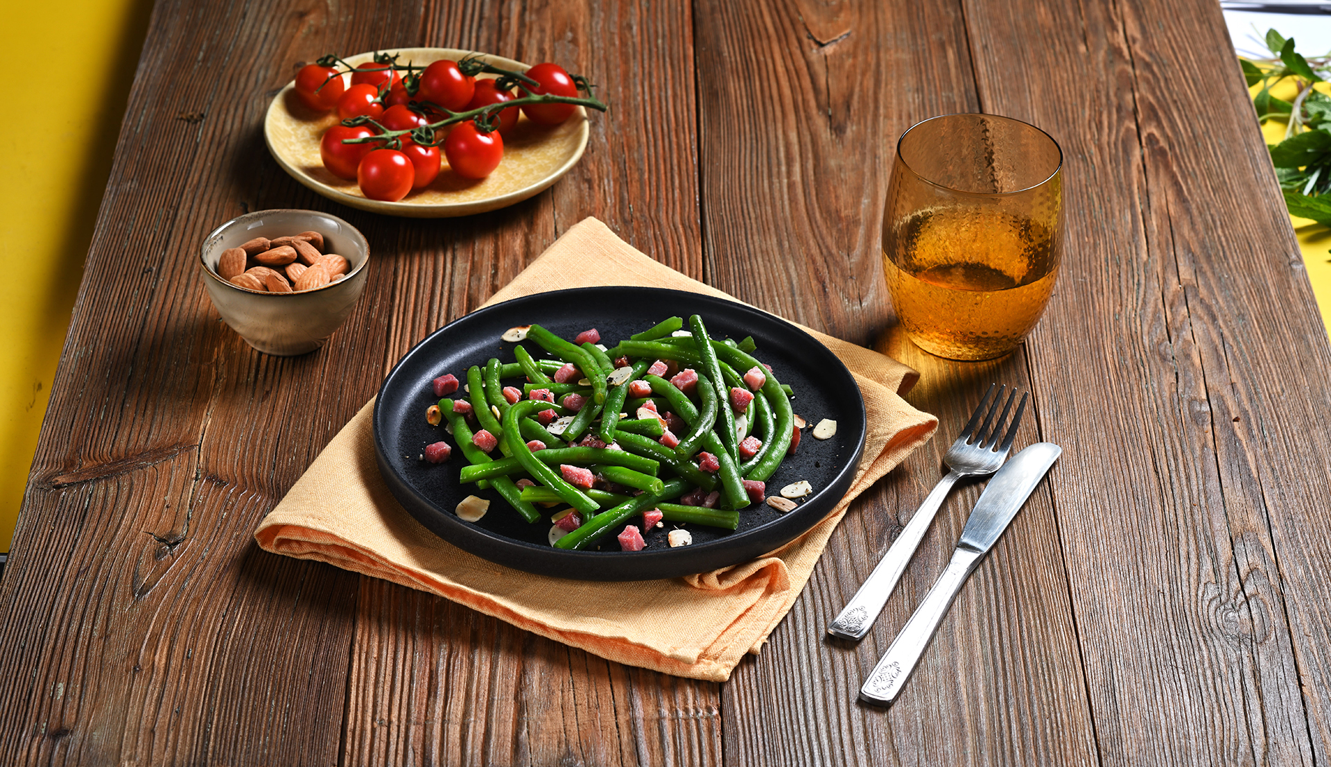 Insalata di fagiolini, mandorle e cubetti di pancetta