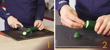 Il primo passo della ricetta è la pulizia e il taglio del cetriolo. Lavatelo bene e poi tagliate via le due estremità (1). Per togliere il sapore amaro del cetriolo bisogna sfregarlo con gli scarti. Si produrrà una specie di schiuma (2).