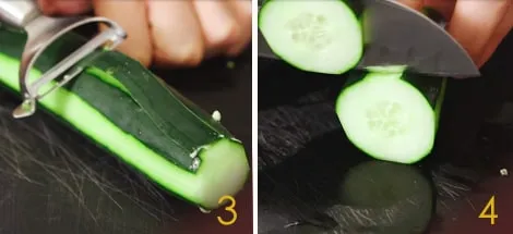 Con l'aiuto di un pelapatate sbucciate il cetriolo in modo alternato (3) e quindi tagliatelo in fettine (4). Mettete il cetriolo affettato in una insalatiera e conditelo con sale, pepe fresco macinato e un filo di olio extra vergine di oliva.