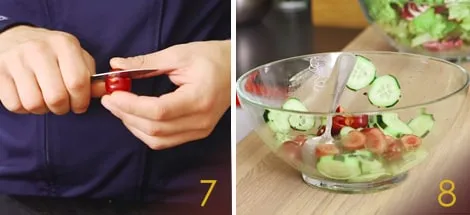 Lavate le ciliegie, privatele del picciolo e tagliatele a metà (7) per snocciolarle più facilmente. Aggiungete le ciliegie all'insalata di cetrioli (8) e mescolate il tutto affinché si insaporiscano a vicenda.