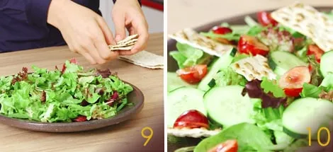 A questo punto potete condire l’insalatina, già lavata e asciugata, con un filo di olio solo per lucidarla e un po’ di sale. Sistematela sul fondo del piatto di portata (9) e inserite il pane azimo fatto in pezzi più piccoli.