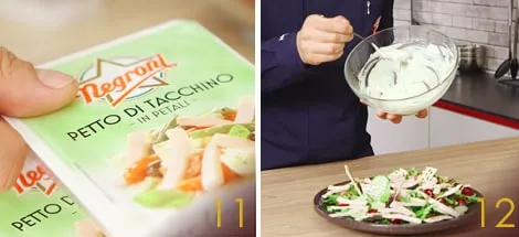 Infine aggiungete il Petto di Tacchino in Petali Negroni, subito pronto all'uso, che regalerà all'insalata sfiziosa a una sensazione carnosa in bocca (11) molto piacevole. Per ultimo aggiungete la salsa di yogurt e menta con un cucchiaio (12) e la vostra golosissima insalata è pronta per essere portata in tavola.