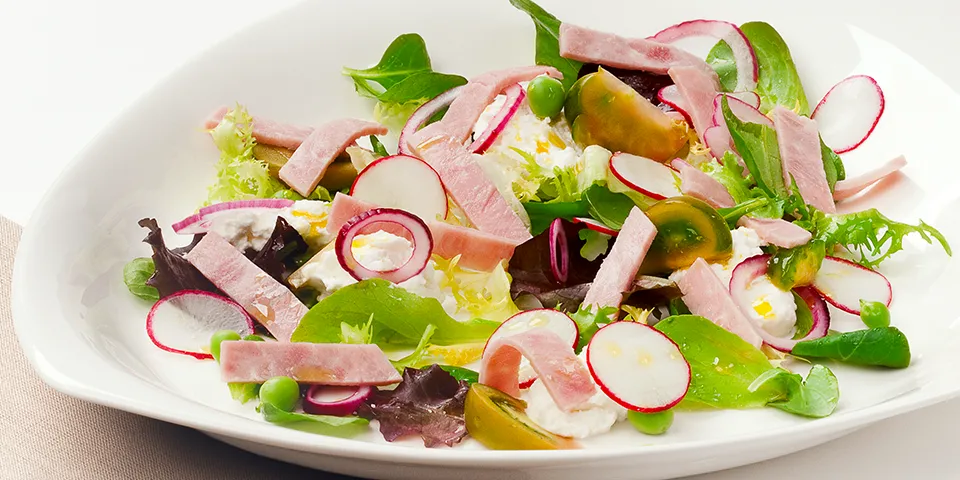 Poco prima di servire aggiungete all'insalata il prosciutto cotto alta qualità Negroni e adagiatela sopra il caprino fresco, terminare con un filo di olio extravergine. Accompagnate il piatto di portata con delle chips di pane. Potete usare del carasau oppure del pane bruschettato o anche dei cracker salati.