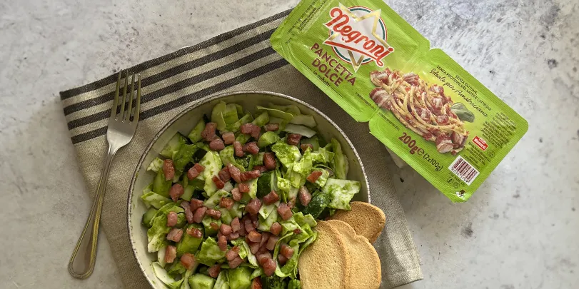 Un last minute goloso e invitante? L'insalata Green Goddess è la ricetta che fa per voi, capace di rendere una pausa pranzo veloce in un vero concentrato di gusto. Una ricetta dai colori vivi e nitidi che vi permetterà di portare nel piatto un'idea irresistibile e golosa allo stesso tempo, impreziosita da tutta la vivacità dei Cubetti di Pancetta Dolce Negroni.