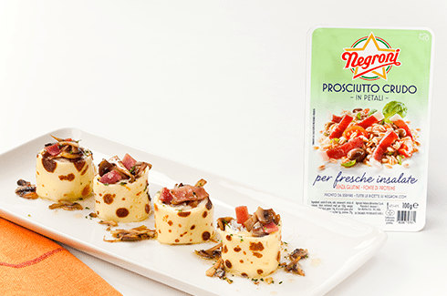Prima di tutto preparate le crepes: frullate uova e latte, quindi aggiungete la farina setacciata e un pizzico di sale. Lavorate fino ad aver eliminato tutti i grumi, poi mettete in frigorifero e fate riposare per 30 minuti. Nel frattempo pulite i funghi e fateli rosolare in padella con uno spicchio di aglio e un filo d’olio. Condite con del prezzemolo. Una volta pronti metteteli da parte. Fate cuocere le crepes imburrando una padella antiaderente ben calda, versateci dentro un mestolo di composto e fate cuocere fino a quando non sarà facile da staccare dalla padella. Girate la crepes e cuocete anche l’altro lato. Una volta pronte tutte le crepes, sistematele su un piatto, conditele con la ricotta e poi distribuite i funghi e il prosciutto crudo in petali. Condite con il sale e il pepe. Arrotolate la crepes e tagliate in rotolini che sistemerete in verticale in un piatto.