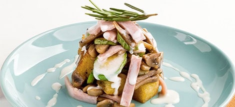 Per rendere le verdure trifolate davvero speciali preparare una salsa con la panna e il taleggio: versate la panna in un tegamino e fateci sciogliere dentro il taleggio. Per impiattare, sistemate il pane sul fondo del piatto e versateci sopra le verdure. Decorate con i petali di prosciutto cotto e terminate con la salsa di taleggio. Per questa operazione potete usare un coppa pasta così da dare una forma a tortino alle verdure trifolate.