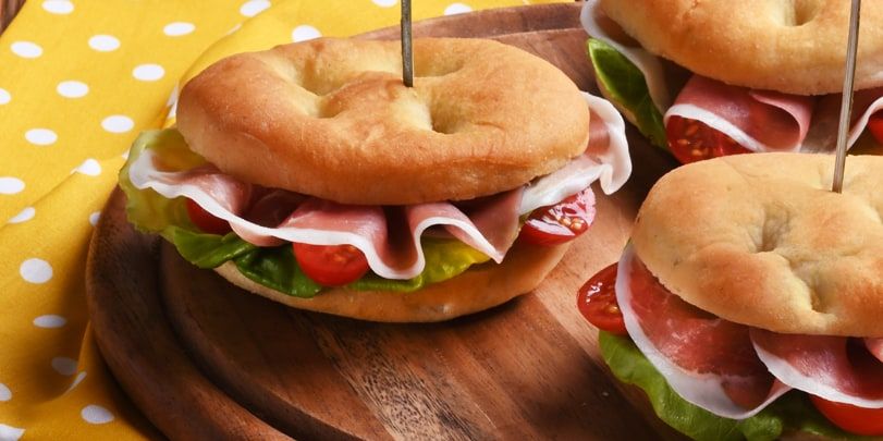 FOCACCINE CON POMODORINI, INSALATA E PROSCIUTTO CRUDO