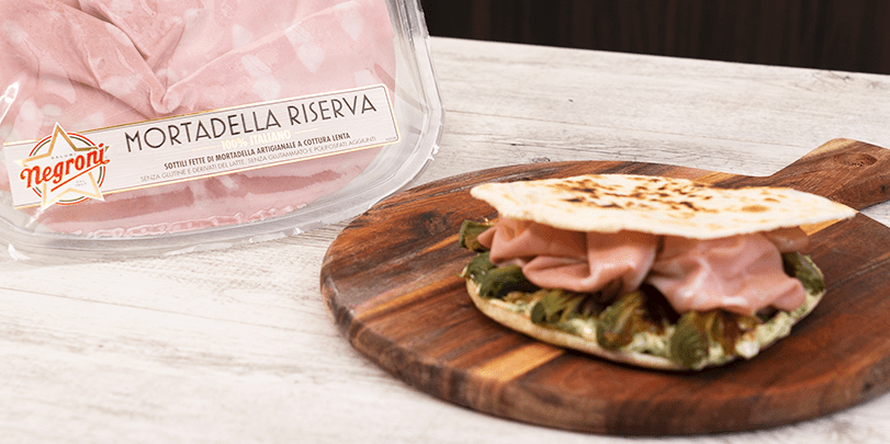 Tagliate ogni disco a metà e farcite con maionese alla rucola, carciofi trifolati e Mortadella Riserva 100% italiana Negroni.