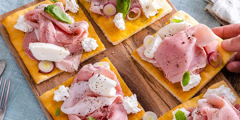 Stendete l’impasto della focaccia in una teglia foderata con carta forno. Conditela con olio extravergine di oliva e un pizzico di sale. Infornate la focaccia a 180°C per 10 minuti. Sfornate la base della focaccia e farcitela con cipollotto tagliato a rondelle, Gran Cotto 100% italiano Negroni, fiocchetti di rucola e foglioline di basilico. Insaporite con un filo di olio extravergine di oliva e una macinata di pepe.