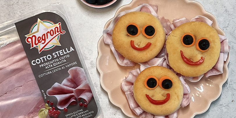 Tagliate le focaccine a metà e farcitele con le fette di Prosciutto Cotto Alta Qualità Negroni. Sopra ogni focaccina sistemate due fettine di carota. Su ogni fettina di carota mettete mezza oliva in modo da creare gli occhi delle focaccine sorridenti.