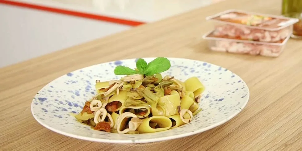 Calamarata condita con carciofi, guanciale e calamari: la ricetta è facile e veloce.