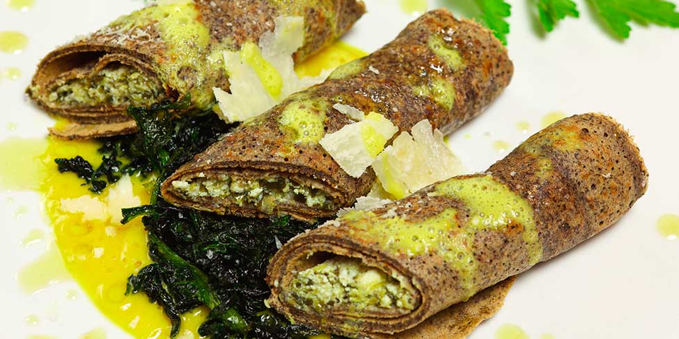 Cannelloni di crespelle di grano saraceno con spinaci e pollo